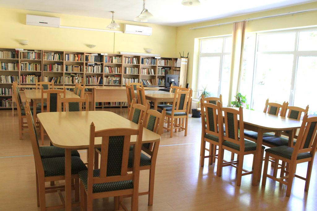 57,57 m2 alapterületű terem, könyvespolcokkal, asztalokkal, székekkel, számítógéppel berendezve. Alkalmas kisebb előadások, csoportos foglalkozások, családi események megtartására.